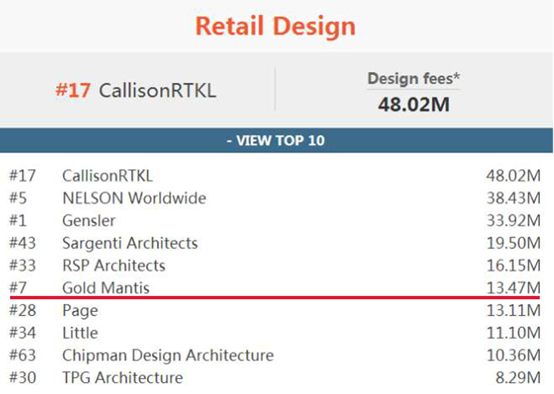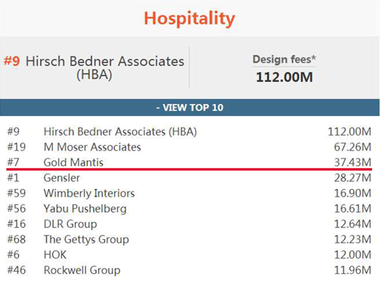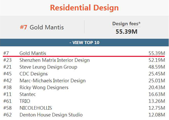Top 100 Giants 榜单是对全球(美国、加拿大、欧洲和亚洲)报名参与的2000多家设计公司调查结果的公示,跻身 Top 100 Giants榜单,是世界知名室内设计企业用来判断自身实力和国际竞争力的重要指标。