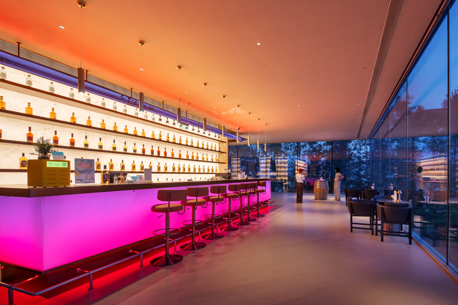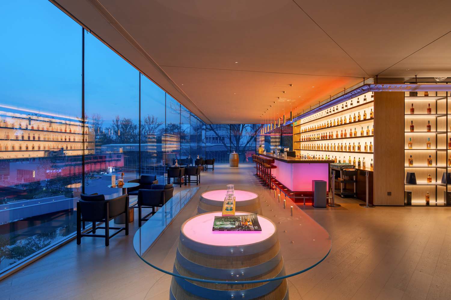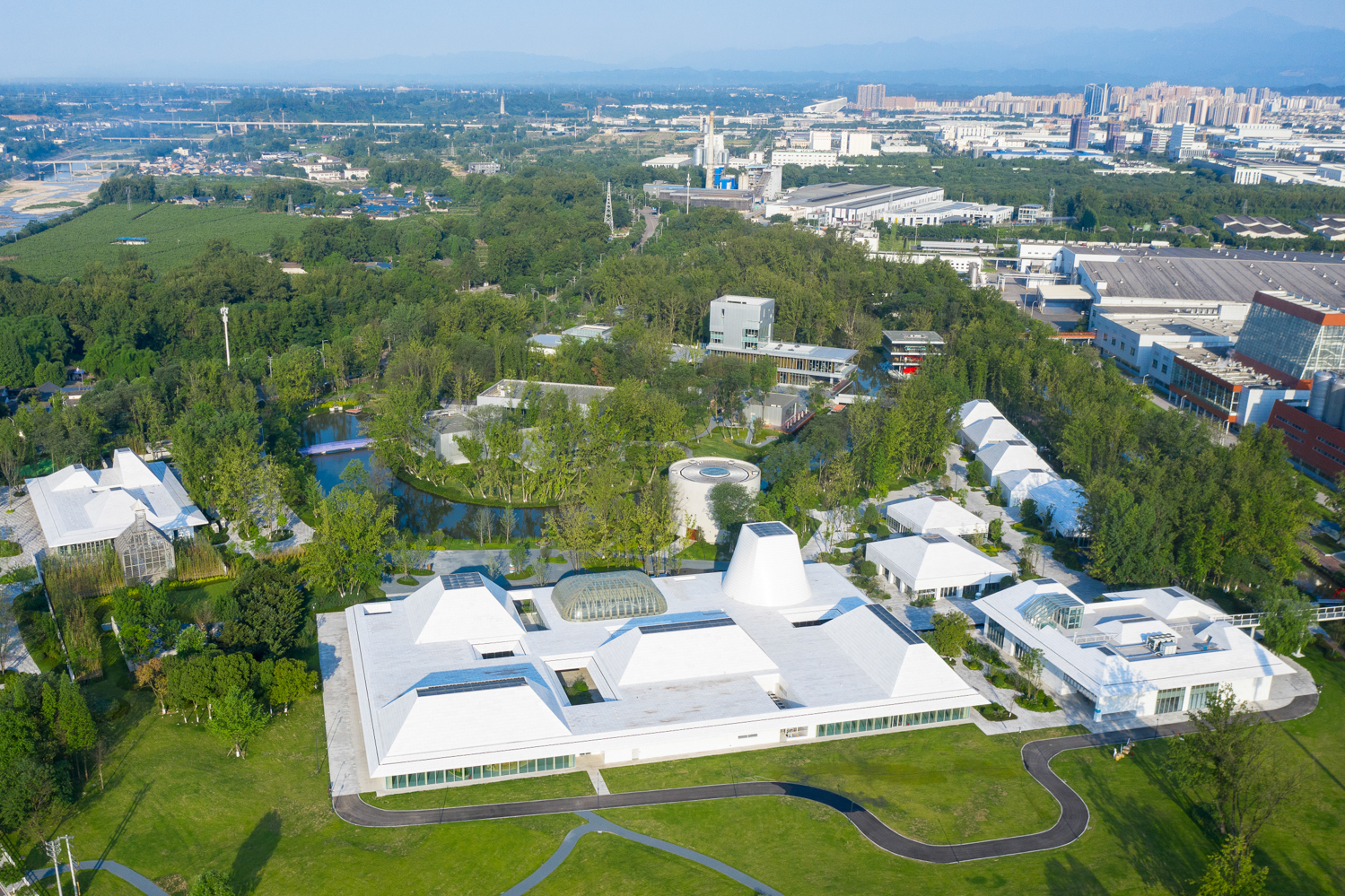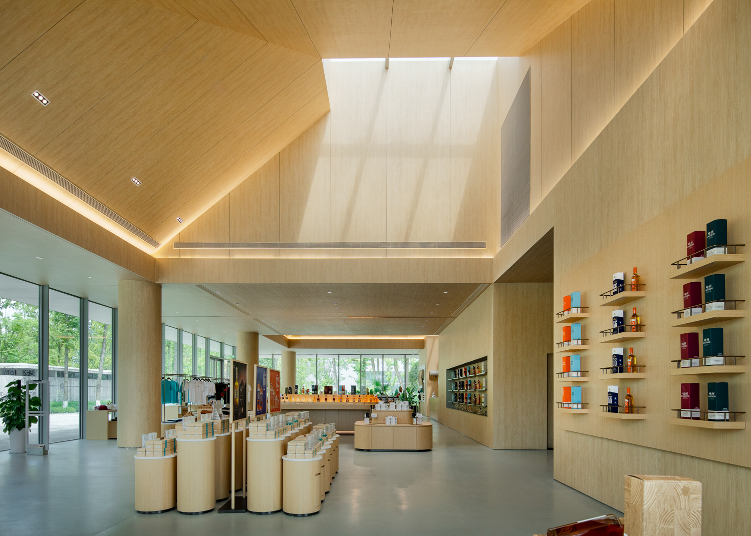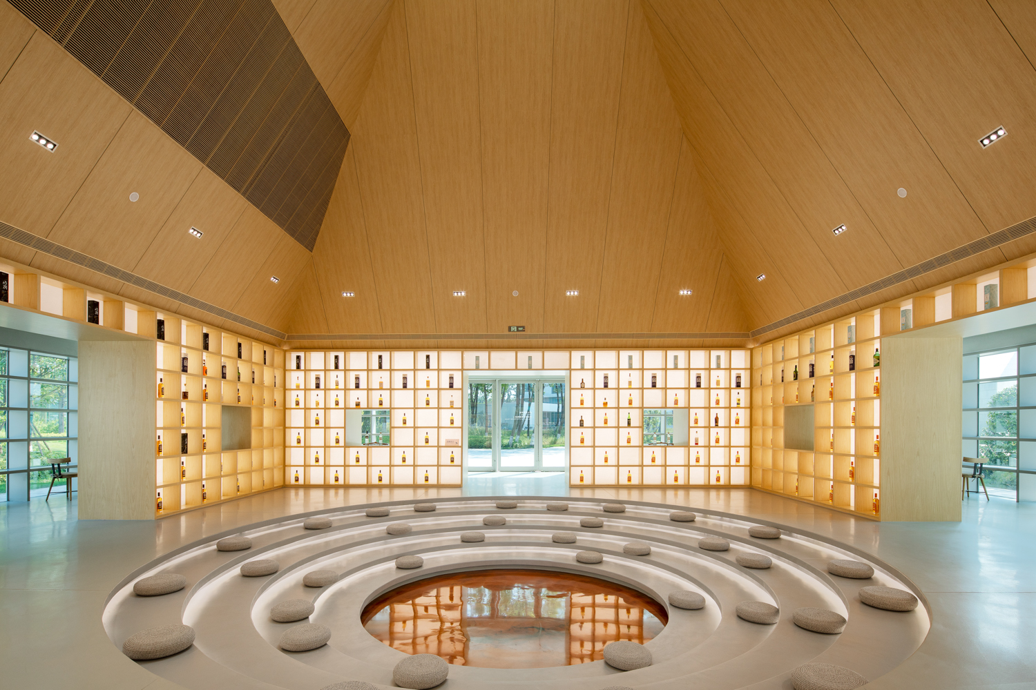 崃州蒸馏厂体验中心将“尊重自然,融于自然”的理念深植于园区设计,演绎着工业与自然融合发展的可持续哲学理念,处处体现着对自然法则的敬畏。建筑设计灵感源自川西风貌,沿湖而建,配套设置齐全,既清净优雅又富有文化底蕴。