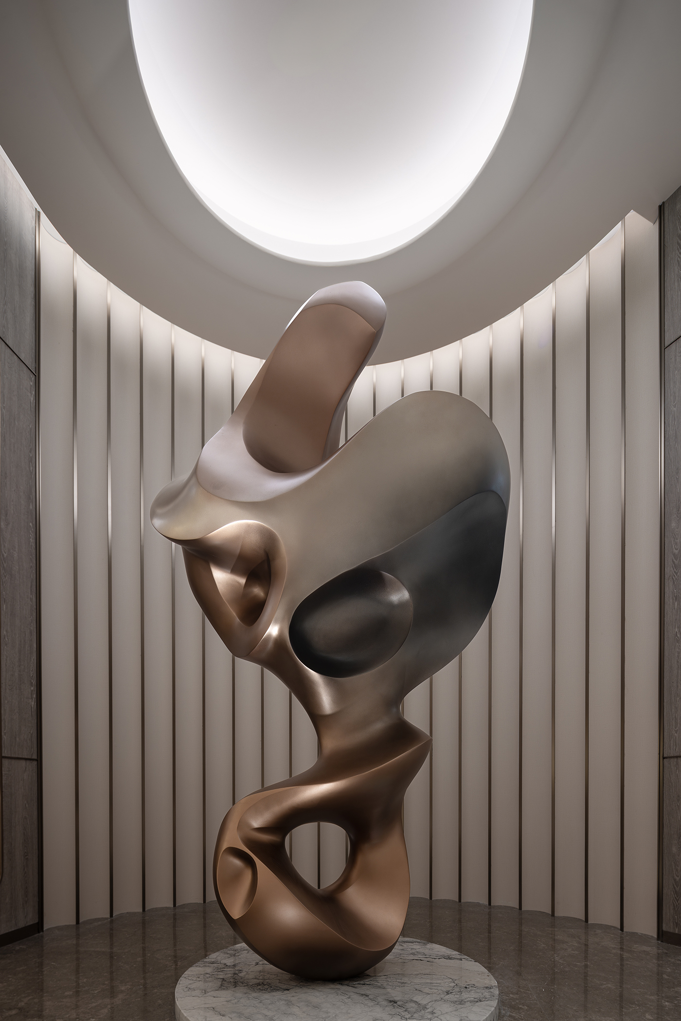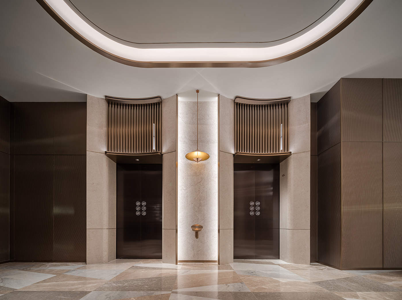 建筑外立面源于南京古城墙意象,以古铜金属板、玻璃、多媒体装置及灯光系统共构,交织出一座既沉稳典雅又张力十足的现代建筑。