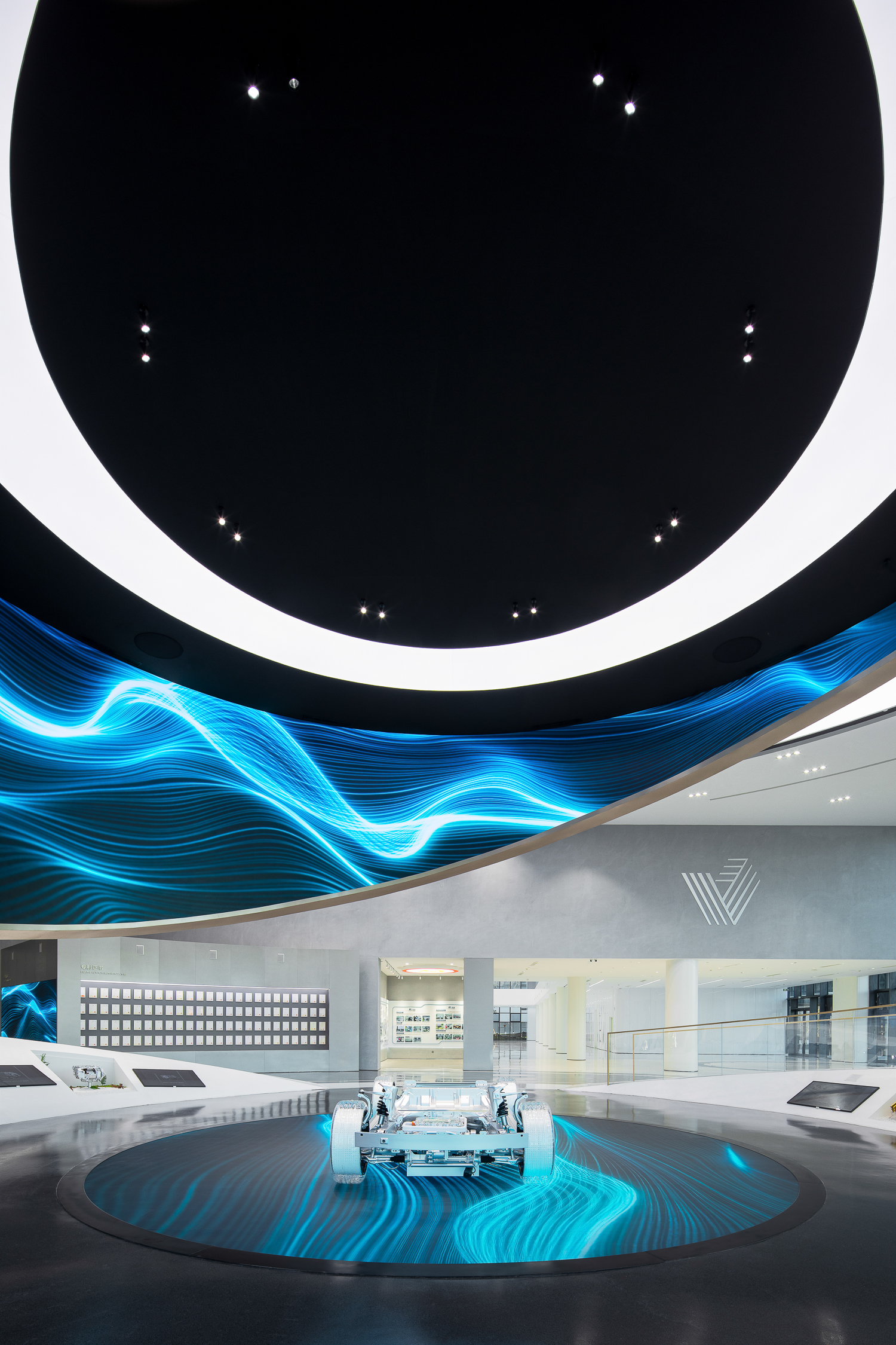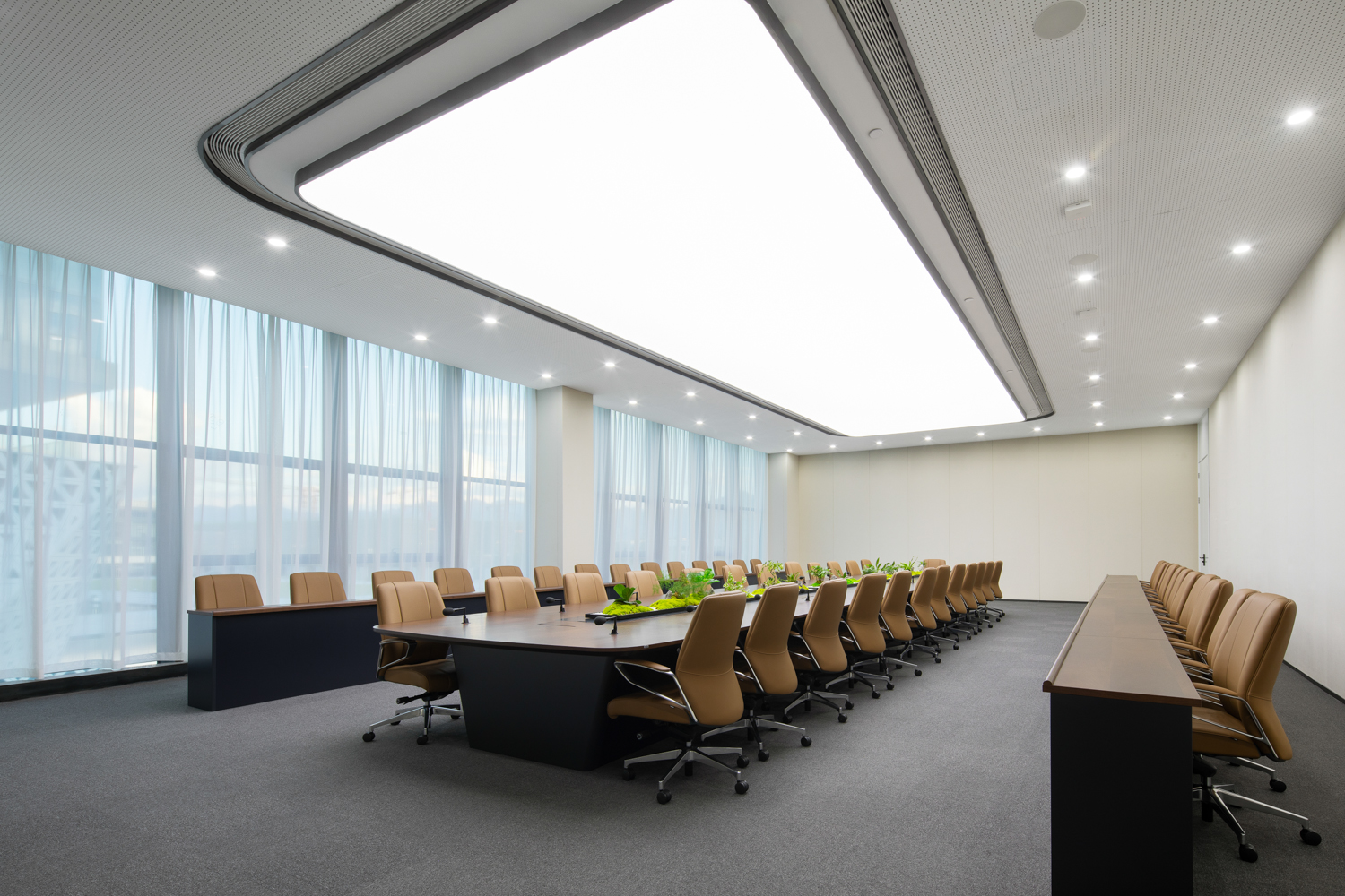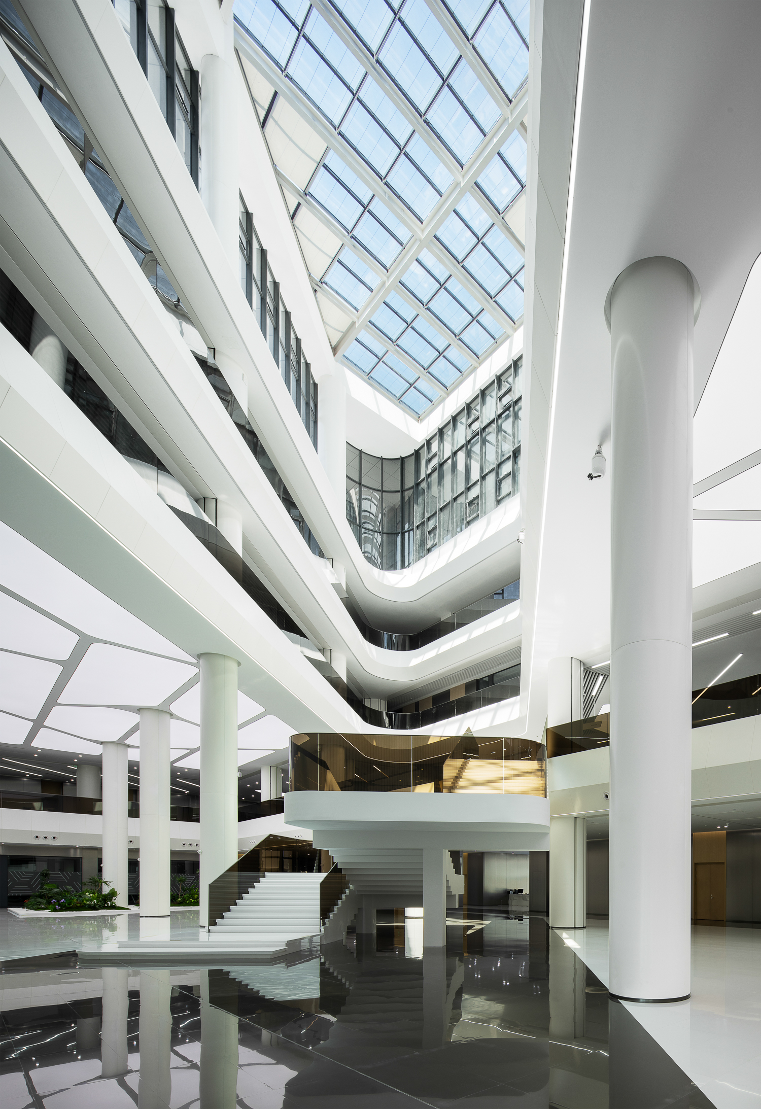 科技感的设计风格延续至室内,“科技静谧,人文温暖”为基调,形成东方智慧、水绿交融的生态理念,保留了作为科技工厂的先锋设计风格,“四水归堂”的中庭概念进一步延伸,形成视觉通廊。