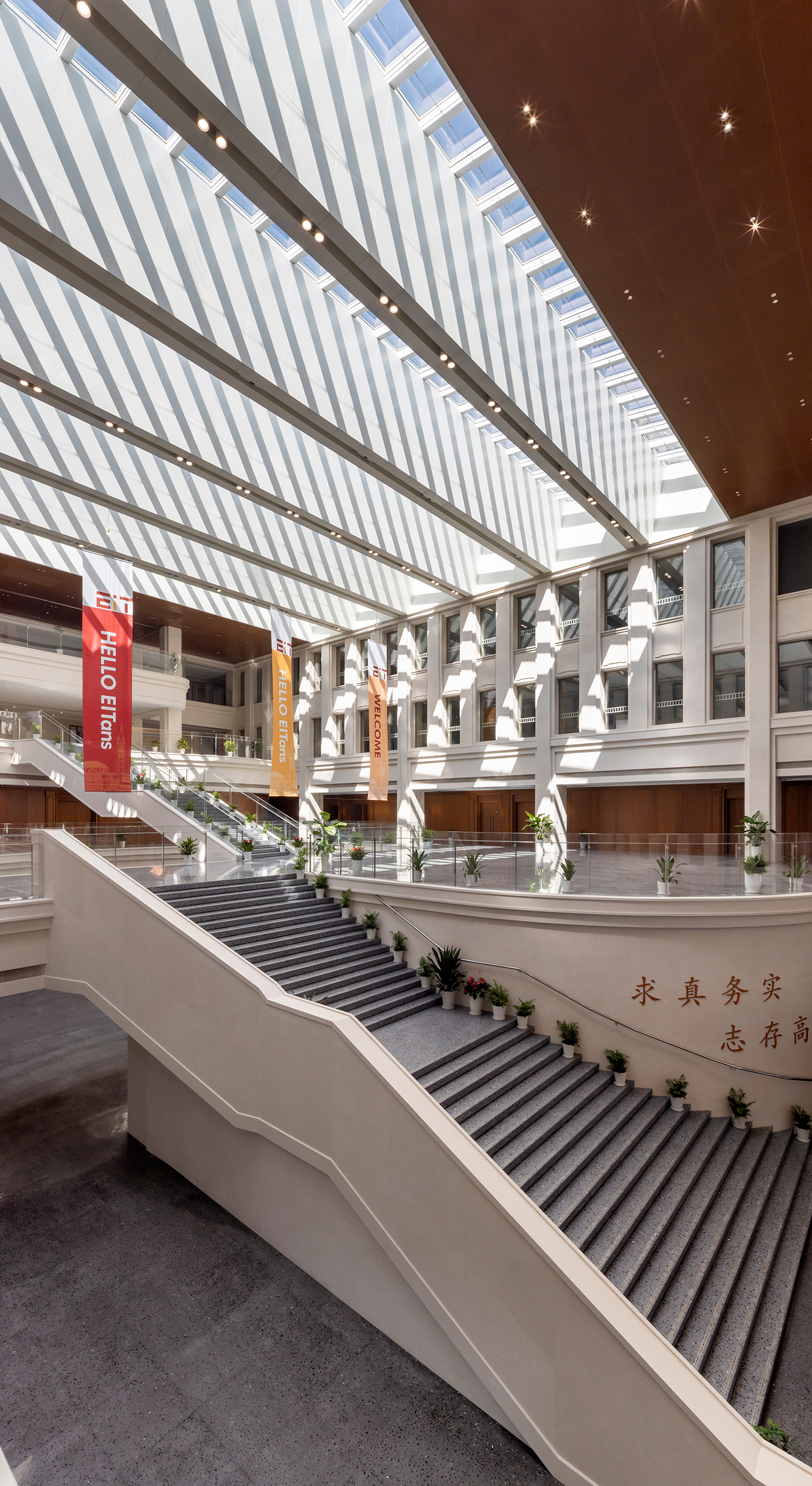 金螳螂参与大学核心区域的商学院、教学实验楼、数理楼、电子楼、公共科研楼、院士楼等室内精装修、建筑幕墙施工,用前瞻创新的工艺打造具有国际视野的新型研究型大学空间。